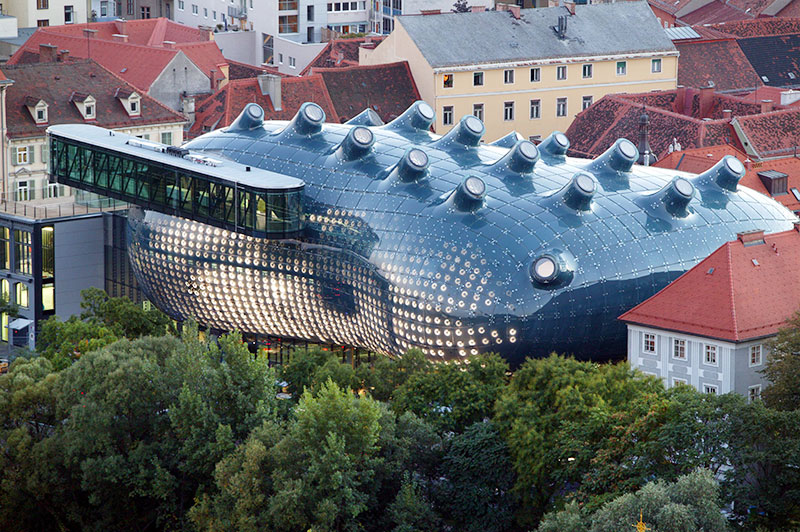 Sorta sulle rive del fiume Mur e progettata dalle archistar britanniche Peter Cook e Colin Fournier, è stata realizzata in soli tre anni, pronta per essere inaugurata nel 2003 quando Graz fu nominata Capitale Europea della Cultura.