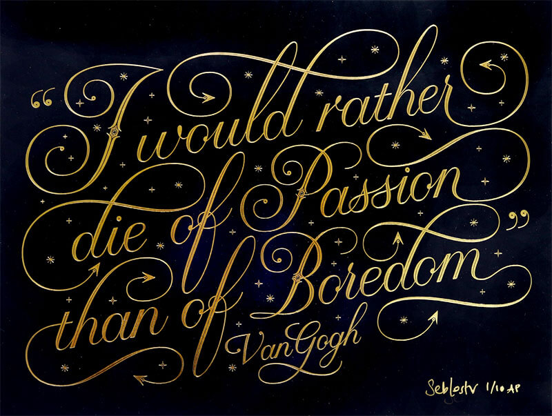 La calligrafia è l’arte della scrittura ornamentale e ha radici antichissime, sia in Europa, sia in Oriente e nei paesi arabi. E’ un’arte che affascina perchè dà forma alle parole donando quindi ai pensieri un “abito” elegante e su misura. Guardando la scioltezza con cui Seb Lester tratteggia loghi famosi, citazioni o frasi a effetto, scrivere con questa eleganza sembra un gioco da ragazzi ma in realtà l’arte della calligrafia, a questi livelli, è decisamente qualcosa fuori dal comune.
