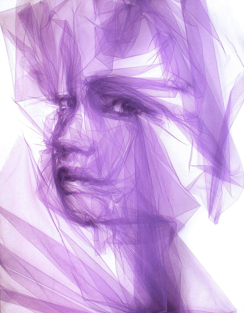 Le sculture di tulle di Benjamin Shine sono realizzate utilizzando un solo lungo pezzo di tessuto che viene piegato e modellato per formare visi e figure, con l’aiuto di un normalissimo ferro da stiro, ago e filo! Usando il ferro, Benjamin Shine piega, modella, dà forma al velo che grazie alla sua trasparenza, livello dopo livello, permette di creare sfumature tonali e ombre, creando i contorni e dando profondità alle figure.