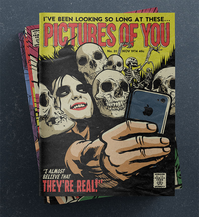 dichiara Butcher Billy e, grazie alla sua matita, Robert Smith diventa il protagonista di un fantomatico fumetto horror vintage, i cui episodi prendono il titolo dalle più celebri canzoni dei Cure. Da “Boys don’t cry” a “Close to me” ogni titolo è interpretato alla lettera, in maniera macabra ma allo stesso tempo ironica e divertente, con un Robert Smith perfettamente a suo agio fra mostri, teschi e cadaveri. In perfetto stile retrò, queste copertine sembrano vere e dispiace davvero che dietro non ci sia un fumetto da sfogliare!!