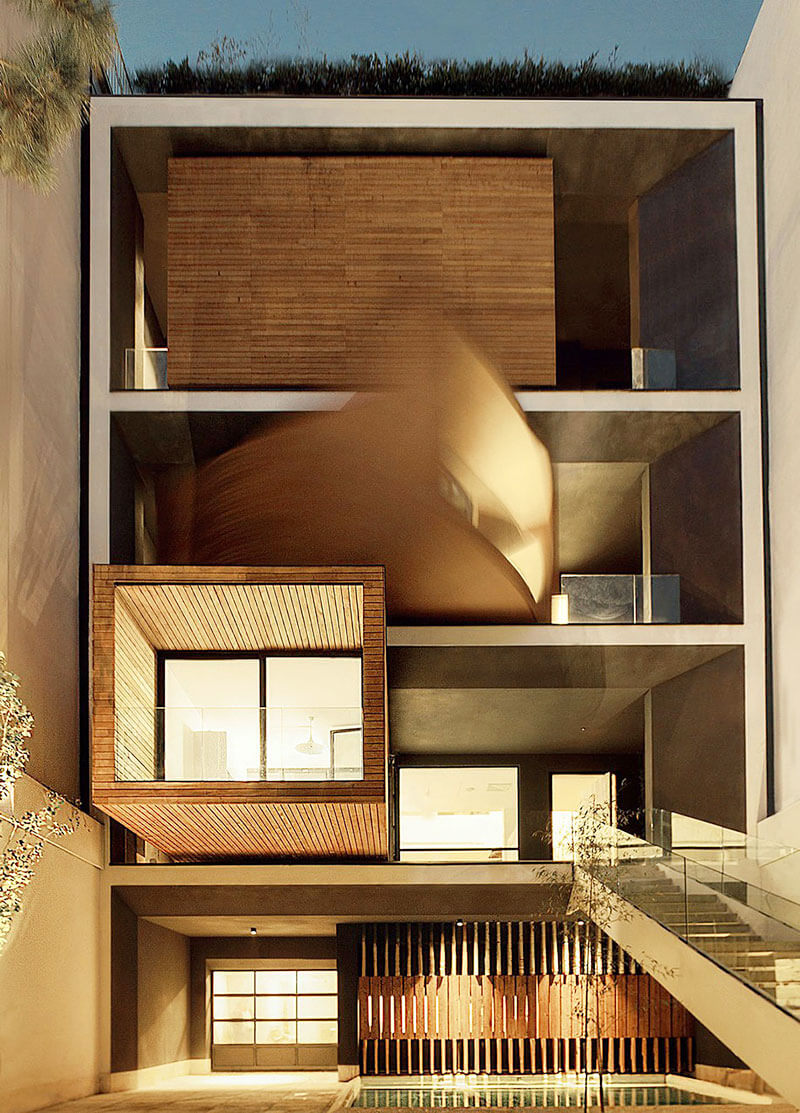 Il progetto della casa rotante è dell’architetto Alireza Taghaboni fondatore dello Studio Next Office. La lussuosissima abitazione sorge in un lotto stretto e lungo e si sviluppa su sette piani, di cui due interrati che ospitano palestra e piscina, un piano per il parcheggio coperto e altri quattro piani fuori terra dedicati agli ambienti di rappresentanza e alle camere da letto, il tutto concluso da un ampio lucernario centrale che illumina il centro della casa.