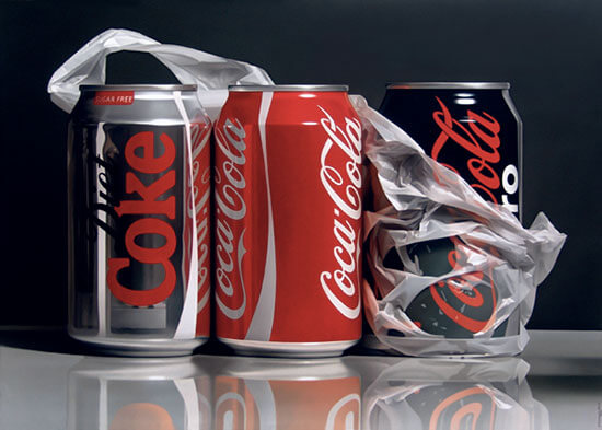 L’iperrealismo di Pedro Campos rende protagonisti oggetti comuni come sacchetti di frutta, barattoli di caramelle, portapenne, biglie, lattine della Coca Cola (che, nel solco di un’attitudine pop mai sopita, ricordano le lattine di zuppa Campbell’s rese celebri da Andy Warhol), tutti resi con una tale perfezione tecnica da renderli estremamente glamour, scintillanti e immutabili nel loro splendore metafisico, quasi astratti!