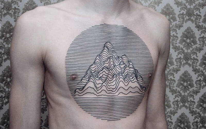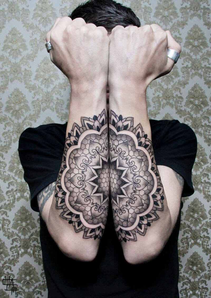 I suoi tatuaggi sono tutti composti di infiniti punti e linee che creano geometrie purissime e curve perfette, in nero assoluto e dal risultato nitido e preciso.