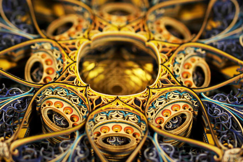 Affascinato dalle incredibili imprese costruttive realizzate nel passato in nome della fede, l’artista ha iniziato a creare le sue opere ispirandosi ai virtuosismi spericolati dell’architettura gotica o alle geometrie sfolgoranti dell’architettura islamica, cercando di riprodurne gli elaborati motivi ornamentali. Il risultato sono meravigliose sculture di carta che imitano l’architettura.