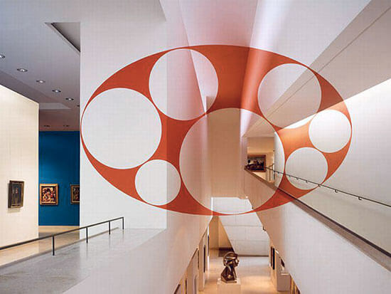 Felice Varini è l’artista svizzero che ha creato queste illusioni anamorfiche, immagini bidimensionali che alterano gli spazi reali e che si possono vedere compiutamente solo da un ben preciso punto di vista perchè in realtà… non esistono!
