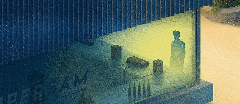 Le illustrazioni distopiche di Marcin Wolski rappresentano scene immaginarie ispirate all’epoca comunista nell’Europa dell’est. Il suo stile rigido e uniforme si ispira a quello della propaganda in voga a quel tempo e i soggetti si concentrano su monotoni paesaggi urbani, enormi strutture industriali, gru e ciminiere. Le atmosfere rarefatte e sospese sono rese così suggestive grazie a un’uso dei colori molto particolare con sfumature soffuse e transizioni tonali.
