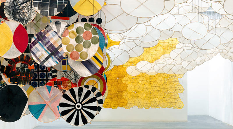 Sono un’esplosione di colori le installazioni fluttuanti dell’artista americano Jacob Hashimoto, aquiloni contemporanei che piovono dall’alto in forme sempre diverse