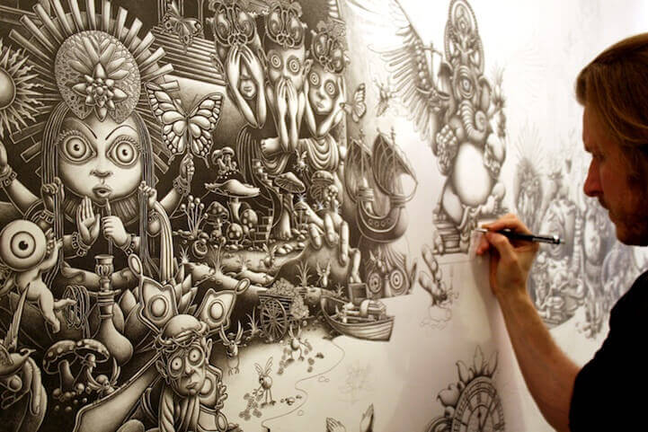 Poi ha deciso di dedicarsi alla sua arte a tempo pieno e uno dei suoi più ambiziosi progetti è sicuramente “Solitude“, un pannello di 2,5×1,5 metri che lo ha impegnato per ben 10 mesi, a partire dal 2010. Come gli altri suoi lavori, tutti di grandi dimensioni, anche questa gigantesca illustrazione è completamente monocromatica, in bianco e nero, realizzata utilizzando matite, penne a inchiostro e colori acrilici.