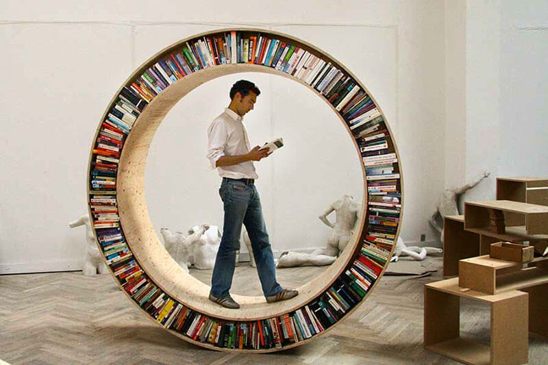 In particolare, la libreria Archive II è esteticamente insuperabile: la forma circolare, già di per sé perfetta, ospita tutti i libri che si possono desiderare. Una sorta di ruota del criceto al cui interno si può passeggiare e che può condurre il lettore in qualsiasi luogo, grazie alle infinite strade che si aprono con la conoscenza. Ma non solo. Pur essendo concepita per il lettore “nomade” che vuole portare i suoi libri sempre con sè, la libreria Archive II consente anche ai più pigri di rilassarsi al suo interno diventando uno spazio intimo dove concentrarsi sul proprio mondo interiore.