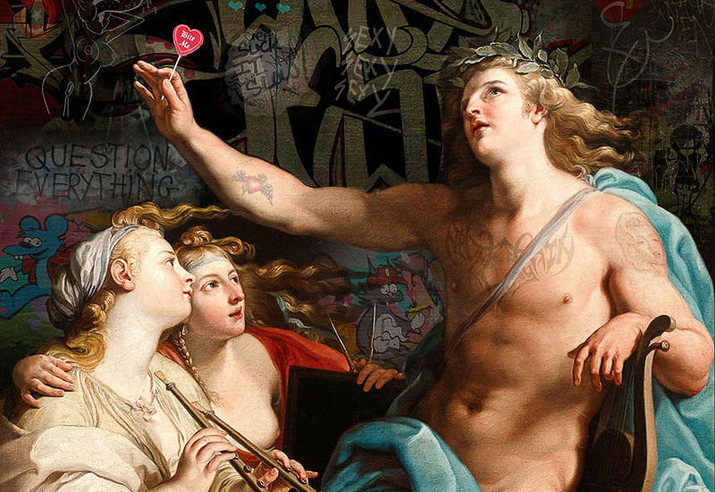 Antichi guerrieri dai corpi scultorei, musici, ancelle e angeli in volo, vengono tatuati come calciatori o rockstar e si stagliano su uno sfondo di astratti paesaggi urbani contemporanei, in sono incorporati la street art, i simboli del consumismo e la cultura pop, da Topolino a Charlie Brown, dalla Gioconda a citazioni di Lichtenstein e Andy Warhol.