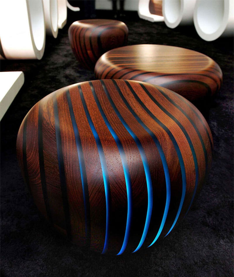 Bright Woods Collection è una bellissima serie di arredi luminosi, ispirati alla notte nei boschi, progettati da Giancarlo Zema. Sedute e tavolini bassi, hanno un sapore etnico e un design organico, con forme morbide e sinuose che nascondono in realtà un alto contenuto tecnologico. La collezione Bright Woods è realizzata in legno. Il materiale viene intagliato in modo da ricordare le venature naturali del legno e al suo interno viene inserita una resina traslucente che si illumina di diversi colori grazie a un sistema di LED integrato. L’effetto è straordinariamente suggestivo e inedito, davvero originale e perfetto per creare l’atmosfera giusta nei più svariati contesti. Questa elegante collezione di arredi luminosi è in edizione limitata, disponibile in diverse essenze e colori. Semplicemente spettacolare!!