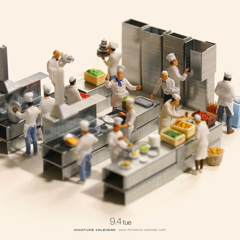 “Tutti prima o poi devono aver pensato che i broccoli e il prezzemolo possono sembrare una foresta di alberi o che le foglie che galleggiano sulla superficie dell’acqua possono sembrare piccole barche. Eventi quotidiani visti da una prospettiva in miniatura possono portarci molti pensieri divertenti. Volevo prendere questo modo di pensare ed esprimerlo attraverso le fotografie, così ho iniziato a mettere insieme il Miniature Calendar. Queste fotografie ritraggono principalmente figure in stile diorama occupate in attività quotidiane.”