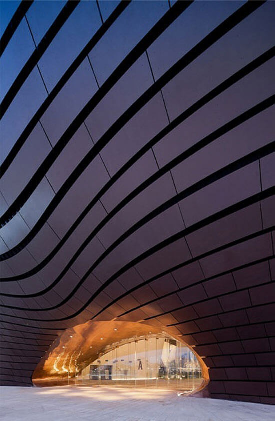 Le sue forme organiche che rimarcano l’essenza del deserto sono concepite in contrapposizione al rigido piano urbanistico della città. Il rivestimento esterno in metallo brunito, riflette gli elementi e i colori e paesaggio circostante e lascia filtrare aria e luce all’interno.