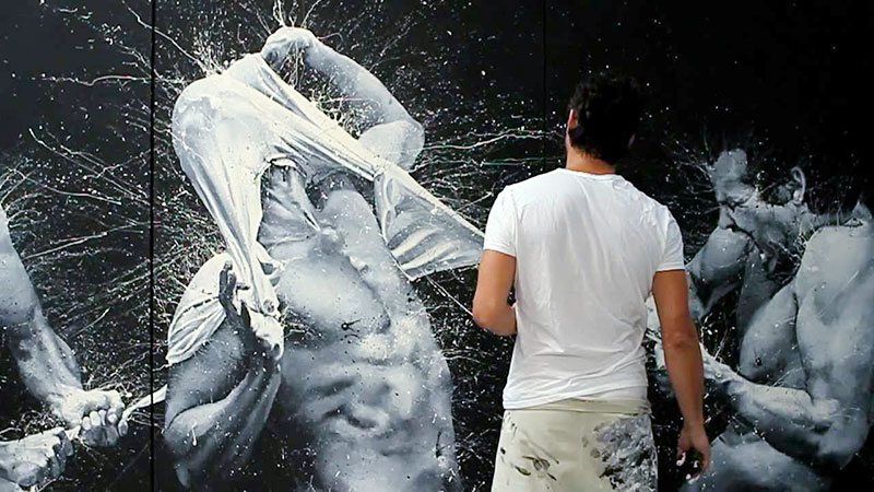 Basandosi su scatti fotografici preparatori per la composizione, l’artista usa solo le mani per realizzare i suoi dipinti, concludendo l’opera con una fase di action painting in cui schizza le sue tele cercando di sfuggire alle regole della pittura figurativa.
