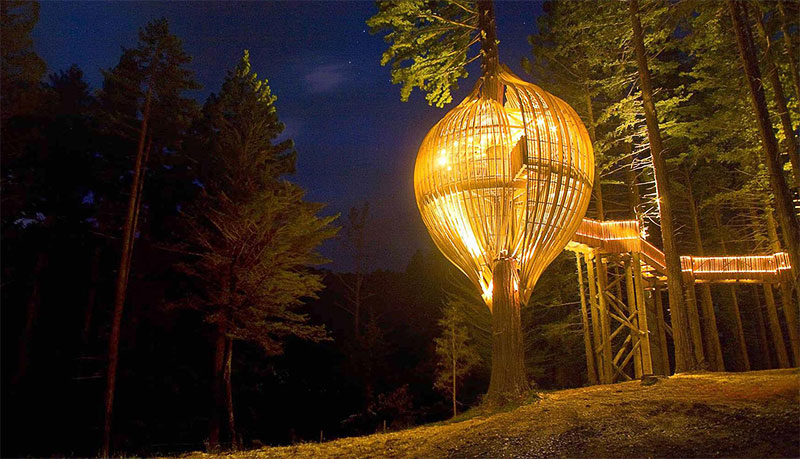 Il Redwood Treehouse è un incredibile ristorante sull’albero che si trova a Warkworthin in Nuova Zelanda. La sua forma organica e affusolata è ispirata alle crisalidi e alle conchiglie marine ma di notte risplende come una lanterna fra le foglie del gigantesco albero su cui è costruito e sembra avvolgerlo morbidamente. Al “bozzolo” si accede attraverso una passerella in legno lunga 60 metri che sale fra gli alberi fino al ristorante.
