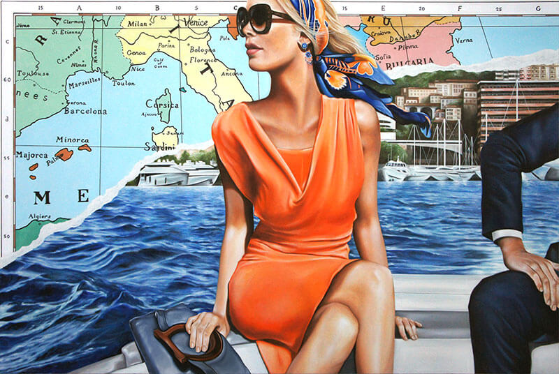 L’uso di forme geometriche costituisce una sorta di cornice per focalizzare meglio l’attenzione sul soggetto. L’inserimento di mappe nei suoi quadri è un elemento “vintage” che trasporta immediatamente lo spettatore in una dimensione diversa, in un passato idealizzato di svago, libertà, lusso e avventura.