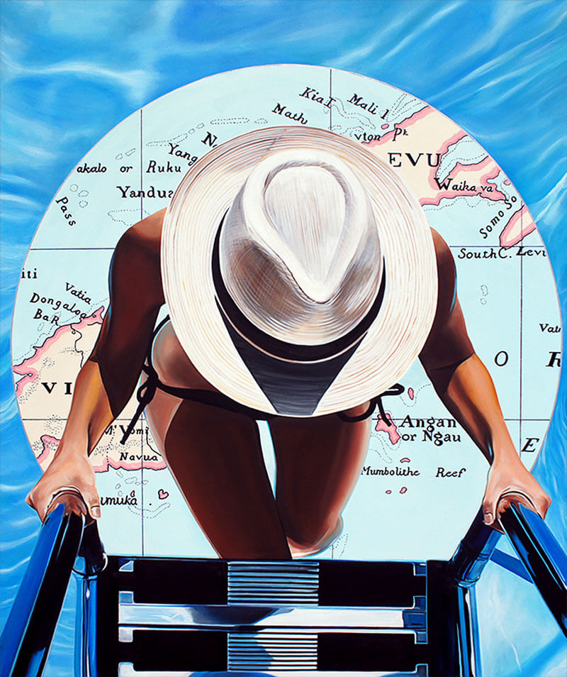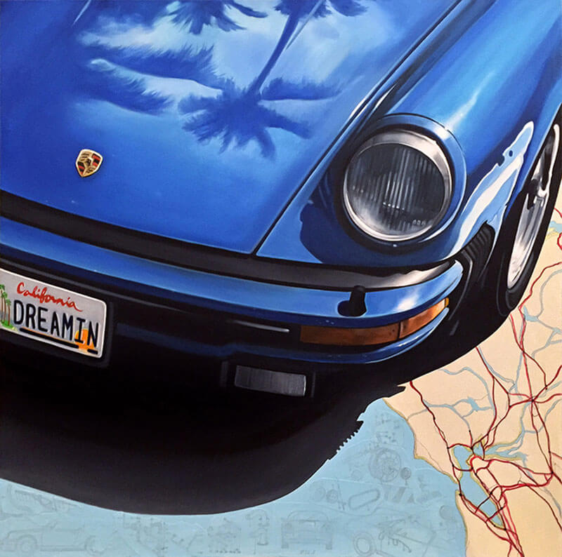Nelle sue tele, atmosfere retrò, location glamour, piscine, motoscafi e macchine di lusso riflettono l’immaginario classico della California, sotto una luce abbagliante che accende la voglia di viaggi e di avventura.