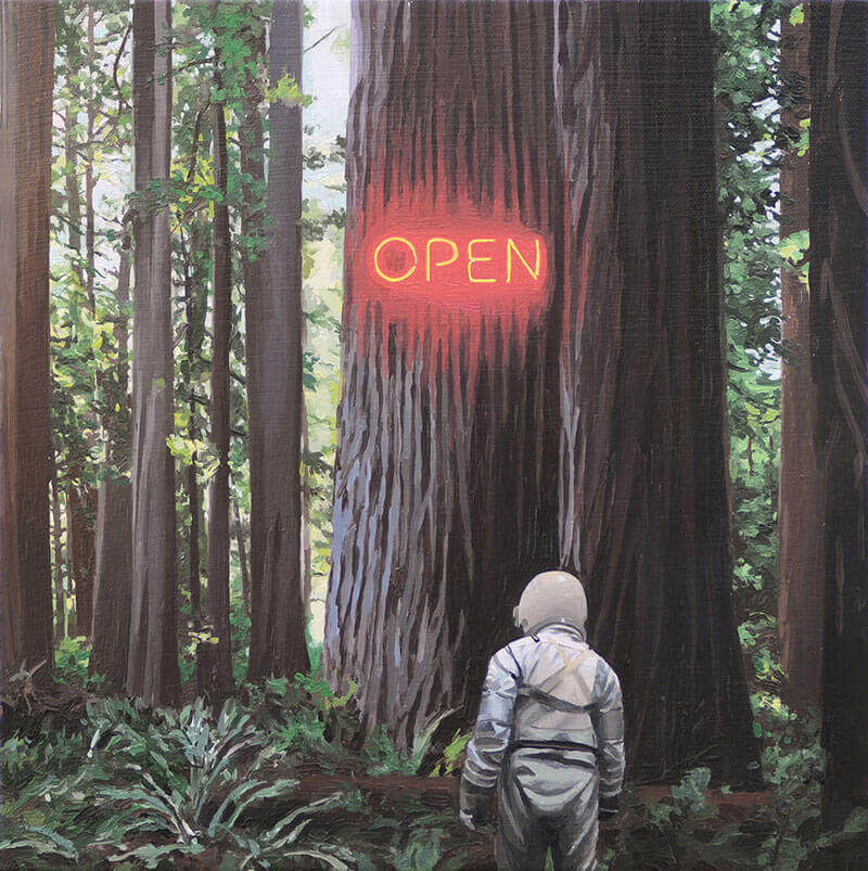 Scott Listfield è un interessante artista americano appassionato di fantascienza e fortemente influenzato dalla cultura pop e dai suoi simboli. Nato a Boston, dopo il college Listfield ha viaggiato un po’ in giro per il mondo e in Europa. Tornato a casa ha iniziato a provare la sensazione di sentirsi un alieno, un estraneo nel suo proprio mondo e ha pensato di dar voce a questa sensazione trasferendola nella sua pittura. Poichè da bambino desiderava diventare un astronauta, ha scelto questa figura come protagonista dei suoi quadri, un personaggio che, pur essendo solo, prova comunque l’eccitazione di esplorare luoghi sconosciuti e meravigliosi.