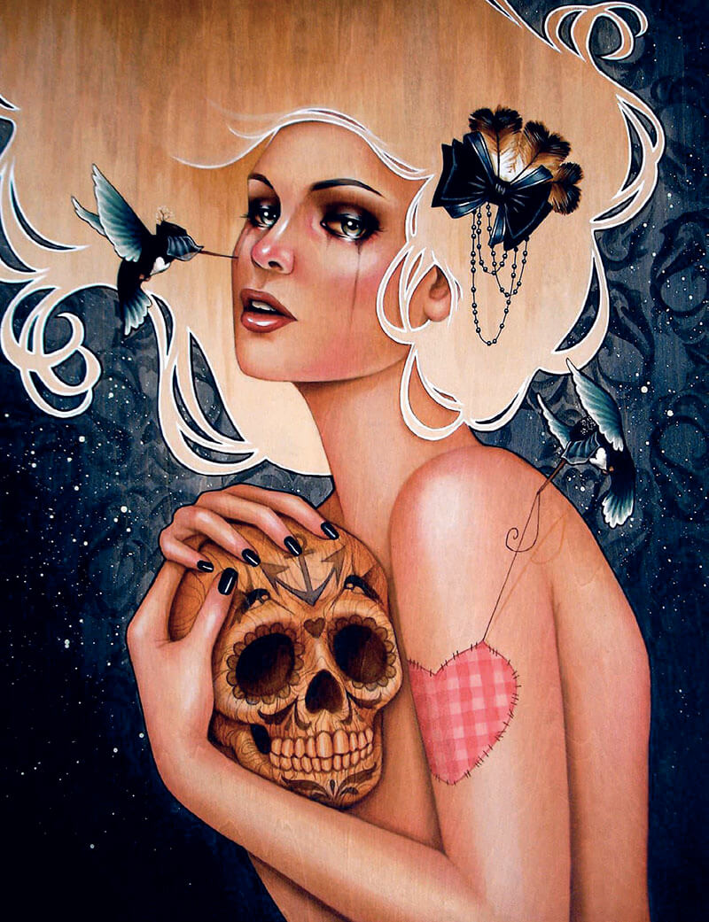 Come artista è fortemente influenzato dall’Art Nouveau e in particolare da Alphonse Mucha – il suo preferito in assoluto – ma anche dal particolare stile grafico dei tatuaggi e dal surrealismo. Nelle sue opere esplora i temi classici dell’amore e della morte, la passione e il conflitto, utilizzando simboli ed elementi ricorrenti che appartengono alla sua poetica personale, in particolare i suoi immancabili colibrì e diversi elementi naturalistici. Il risultato è sempre pieno di forza, speranza e bellezza e le sue protagoniste, sempre ammiccanti, sono piene di sensualità e sfrontatezza.