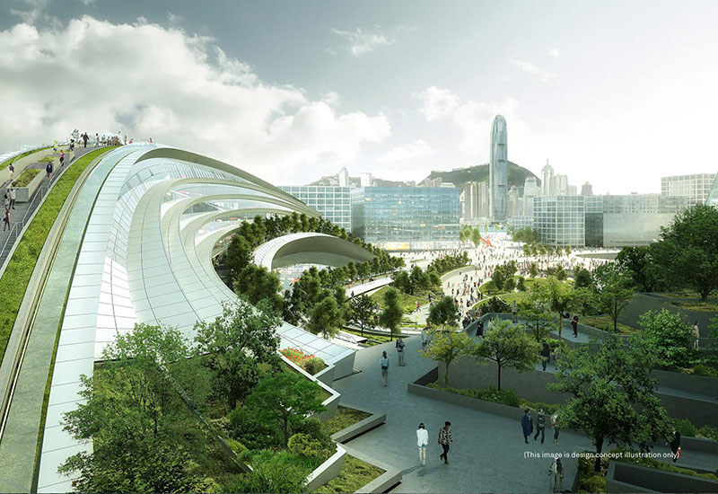 I percorsi pedonali si sviluppano in modo fluido fra interno ed esterno, dalla hall alla piazza al giardino pensile realizzato sulla copertura della stazione. Qui trova spazio un vero parco urbano ricco di vegetazione che si solleva fino a 25 metri dalla piazza e a 45 dalla hall delle partenze sottostante. Da lassù si potrà ammirare il panorama della città a 360° con la vista sullo skyline del centro cittadino e del Victoria Peak, la vetta più alta di Hong Kong.